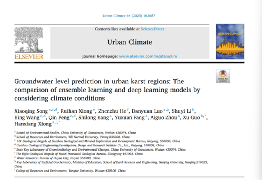 近日,国际权威学术期刊《Urban Climate》(JCR一区,影响因子6.9)发表题为“Groundwater level prediction in urban karst regions: The comparison of ensemble learning and deep learning models by considering climate conditions(城市岩溶地区地下水位预测:考虑气候条件的集成学习和深度学习模型的比较)”的研究论文。该成果由111队地下水团队完成,标志着岩溶区地下位动态研究取得了阶段性进展。