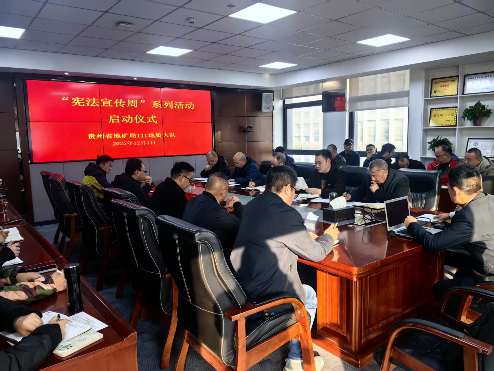 12月1日上午,在第十二个国家宪法日即将来临之际,贵州地矿111队于六楼会议室开展了2025年“宪法宣传周”活动启动仪式。该队党委负责人作动员讲话并对此次活动的目的和意义进行了强调,大队班子成员、中层干部、职工代表近60人参加。